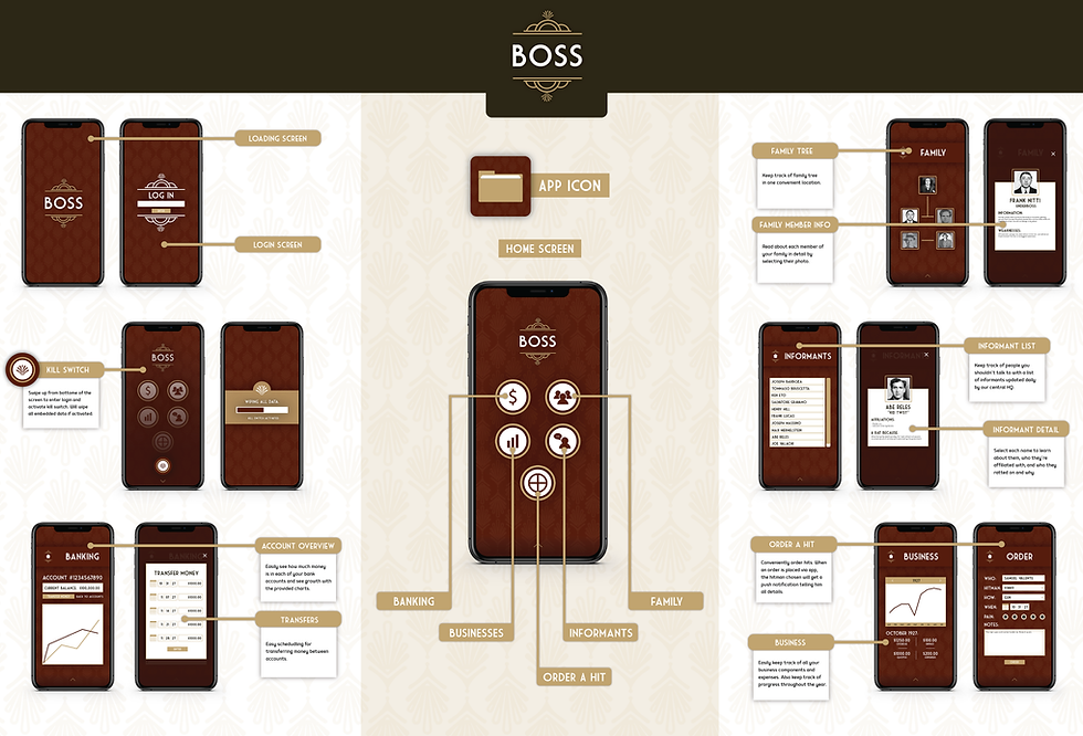 I was given the brief of designing an app that would be used in an alternate universe based off of a movie genre. I was given the True Crime genre. I decided to delve into the mob sub-category of True Crime and create an app that a mob boss would use. The mobile app Boss has features like ordering hits, banking (money laundering,) keeping track of the family tree, business management, and keeping track of "rats."There are also other useful features, like a kill switch that would wipe all information stored in the app. I based the Boss app off of Al Capone and the 1920s and 30s. The icons are all pretty inconspicuous, including the hero icon. The motivation behind making the icons so generic was to make the purpose of the app less apparent to those who don't need to know.